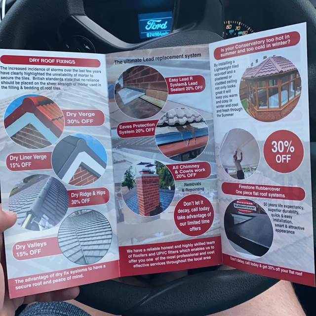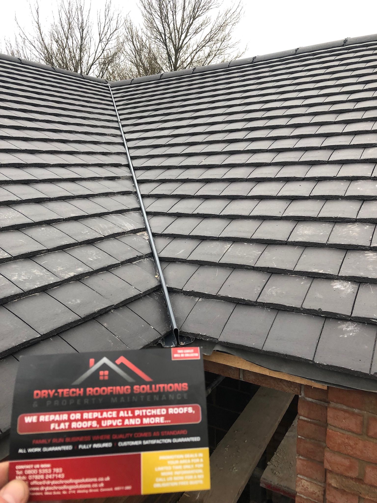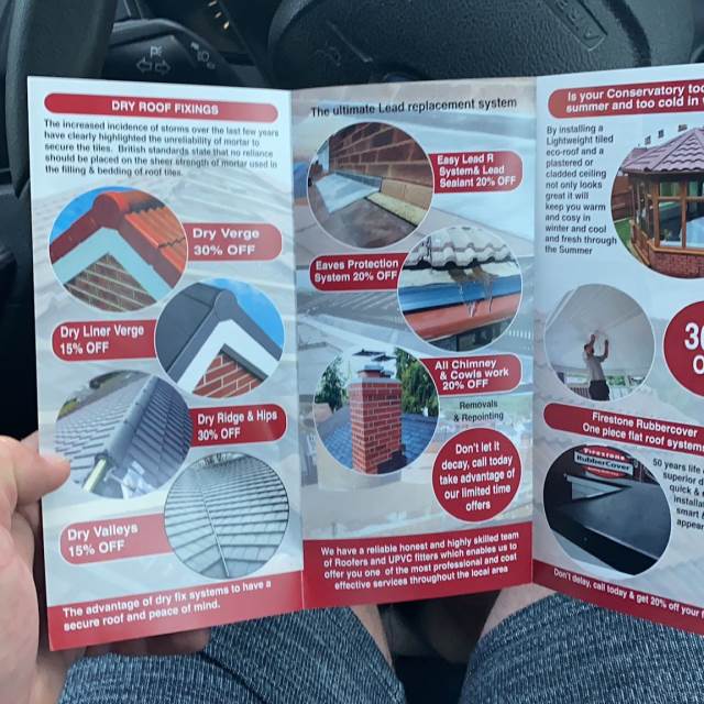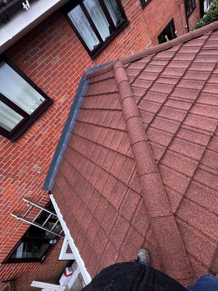 " Very professional: thorough inspection beforehand to see what was required. Quotation given in writing, detailing all aspects of work to be undertaken. Options given for flat roof repair or full replacement and main roof ridge tile system. Cleared all rubbish and hosed down drive. Main roof ridge tiles and dry verge system and flat orangery roof sorted in two days. Fast efficient service, carried out by a polite and friendly team. "